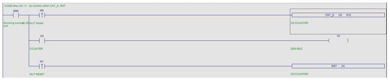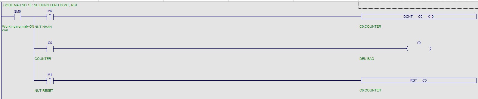 + Để chuyển trạn thái Y0 thành OFF, cần ON M1 => Reset giá trị của C0 => Coil C0 trở về trạng thái OFF và đầu ra Y0 sẽ OFF.