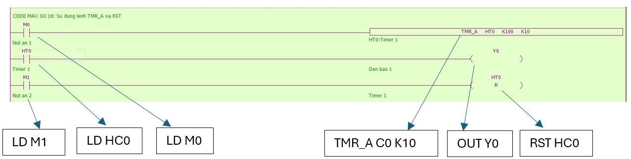+ Để chuyển trạn thái Y0 thành OFF, cần ON M1 => Reset giá trị của HC0 => HC0 trở về trạng thái OFF và đầu ra Y0 sẽ OFF.