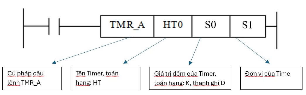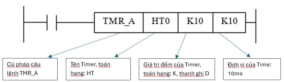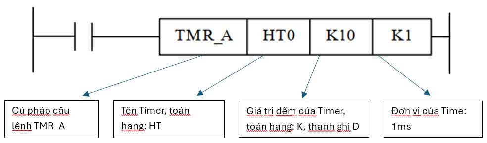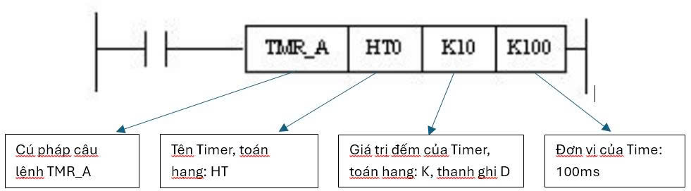 - Lệnh TMR : lệnh TMR là lệnh timer cho phép lập trình viên cài đặt các khoảng thời gian trễ trước khi thực hiện 1 hành động nào đó hoặc duy trì trạng thái trong 1 khoảng thời gian nhất định.