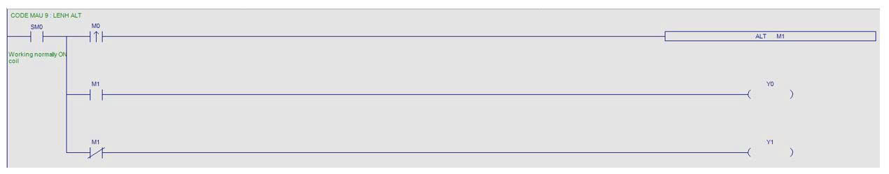 + Khi kích M0 ON thì bit M1 ON lên rồi OFF xuống, lệnh ALT đảo bit M1 thành ON từ đó đầu ra Y0 ON.