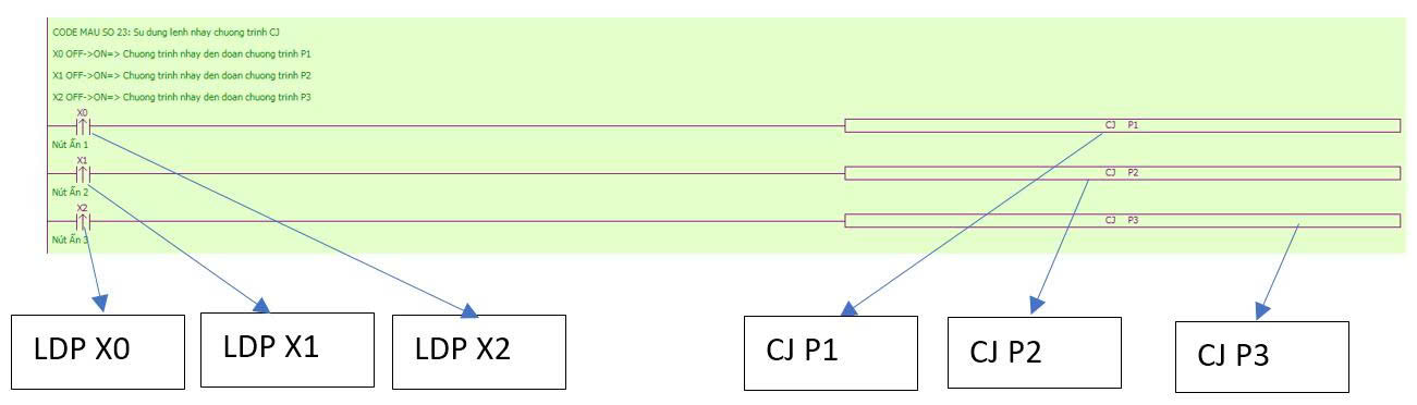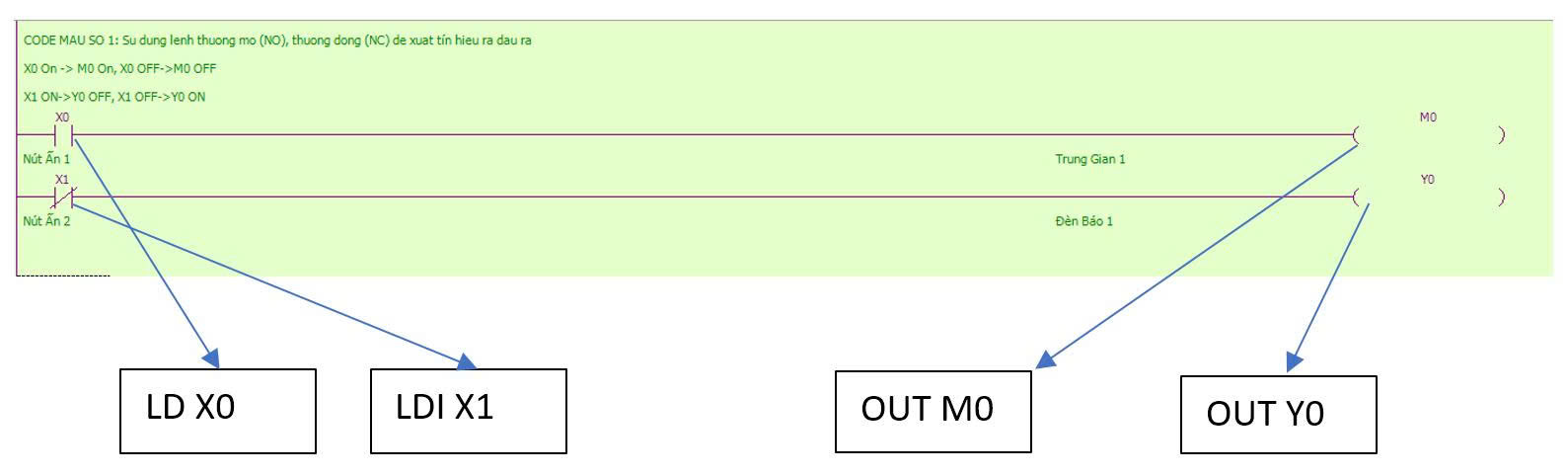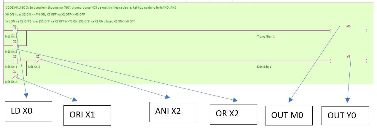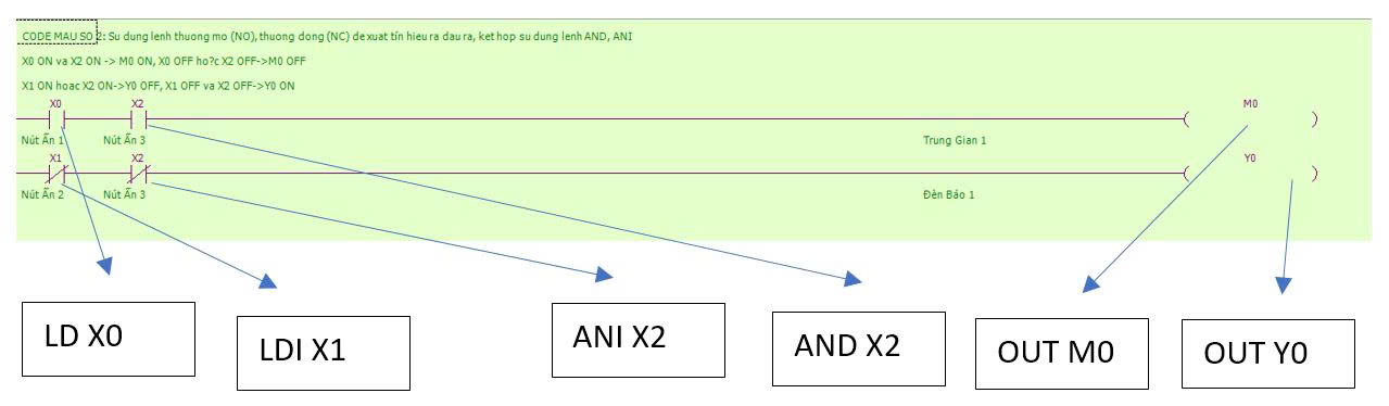 CODE MẪU 2: VIẾT CHƯƠNG TRÌNH SỬ DỤNG LỆNH LD, LDI, OUT KẾT HỢP LỆNH AND, ANI