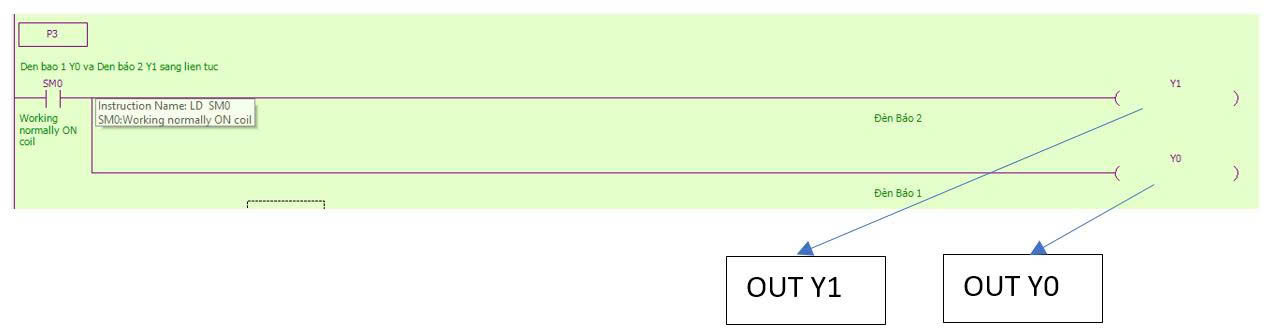 + Khi M1 ON lên và X3 OFF thì đầu ra Y3 ON, M1 OFF thì đầu ra Y3 OFF.