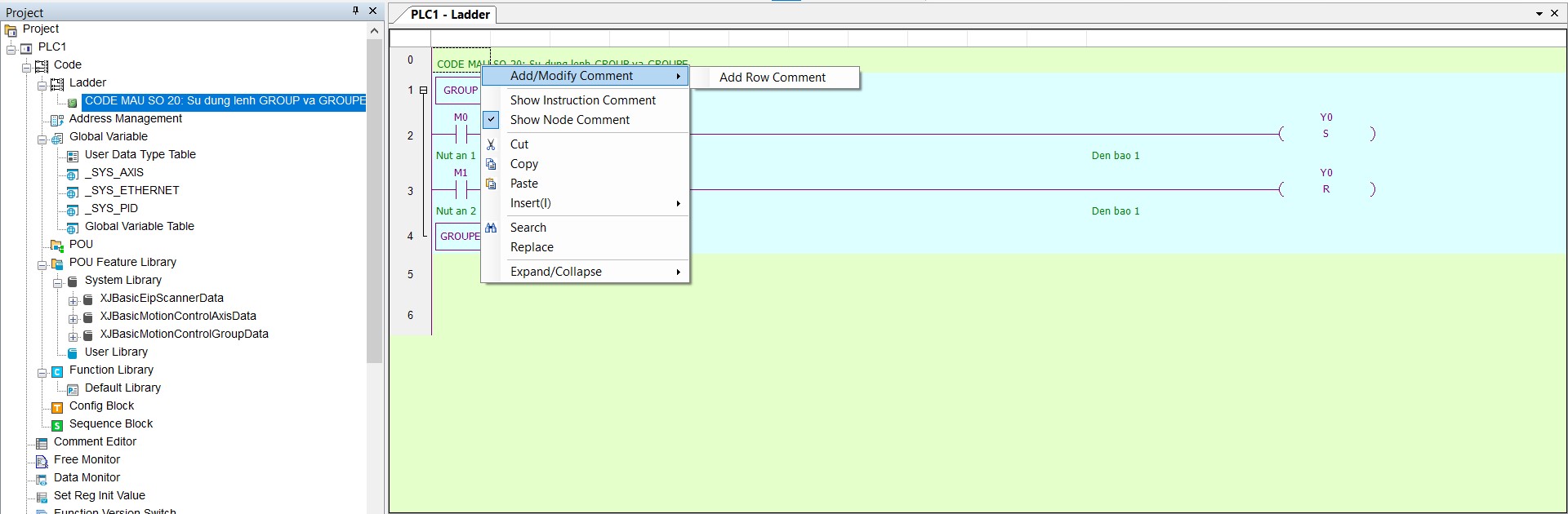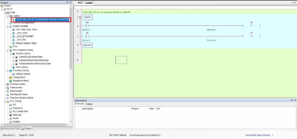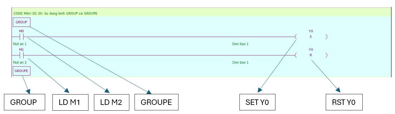 - Lệnh GROUP và GROUPE sẽ tạo ra 1 nhóm nhỏ để dễ dàng quản lý chương trình PLC tổng thể. Khi tạo 1 GROUP thì sẽ được hiển thị ở hình dưới: