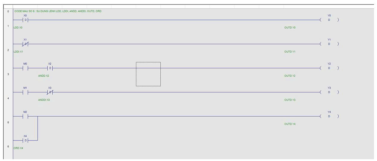 - Các lệnh LDD, LDDI, ANDD, … cũng giống như LD, LDI, AND, … tuy nhiên nó sẽ đọc tín hiệu trực tiếp từ thiết bị đầu cuối ( tín hiệu X ). OUTD cũng giống như OUT tuy nhiên nó sẽ đọc trực tiếp tín hiệu đầu ra Y mà không cần đợi đến vòng quét tiếp theo.