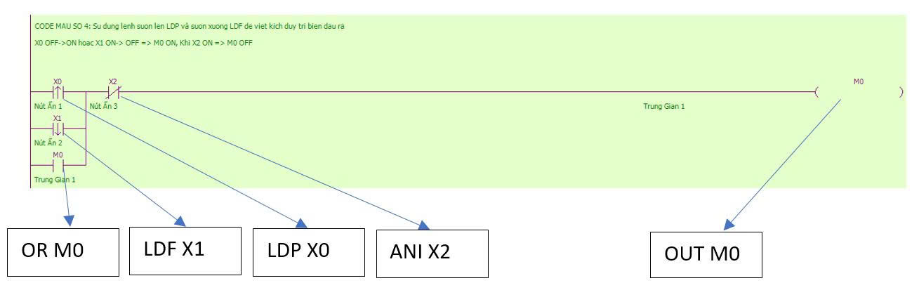 - Lệnh LDF: lệnh sườn xuống, khi biến chuyển trạng thái từ ON->OFF thì lệnh này được thực thi, được sử dụng cho các biến như X,Y,M,HM,SM,S,HS,T,HT,C,HC,Dn.m.