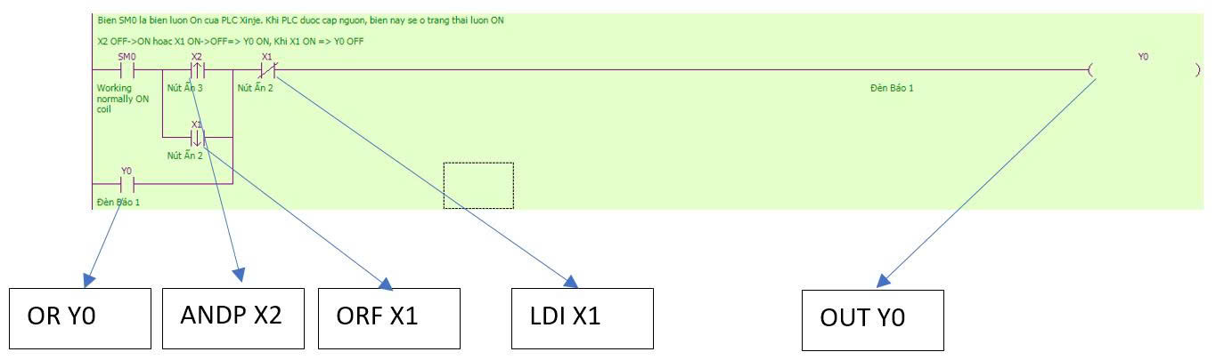 + Khi X0 OFF->ON hoặc X1 ON->OFF thì đầu ra M0 On lên, X2 ON thì đầu ra M0 OFF.