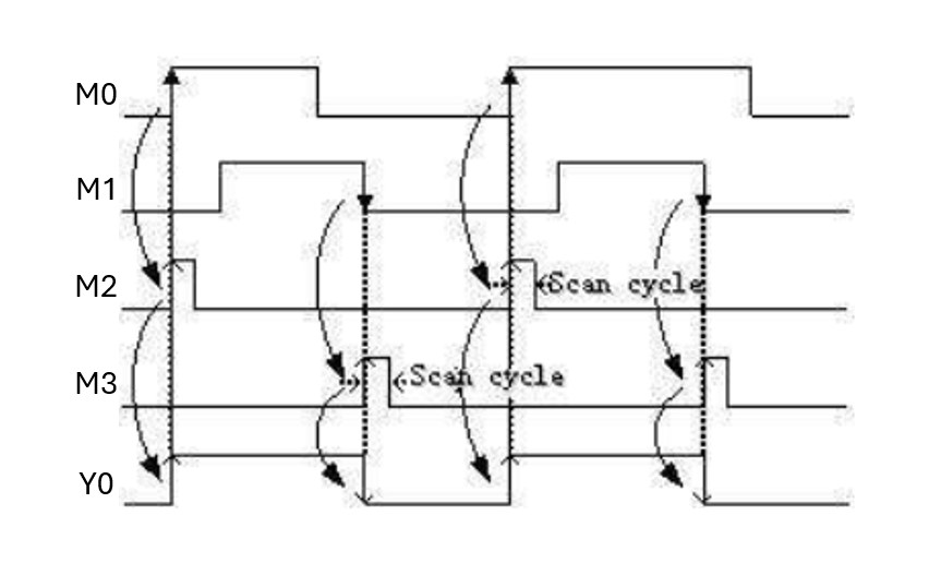 - Lệnh PLS: Bit đầu ra Y hoặc bit trung gian M sẽ được ON trong khoảng thời gian quét ngay khi bit đầu vào chuyển từ trạng thái OFF sang trại thái ON.