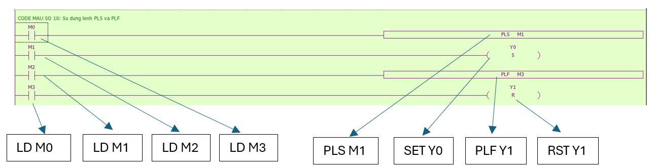 - Lệnh PLS: Bit đầu ra Y hoặc bit trung gian M sẽ được ON trong khoảng thời gian quét ngay khi bit đầu vào chuyển từ trạng thái ON sang trại thái OFF.