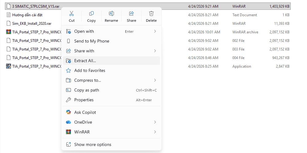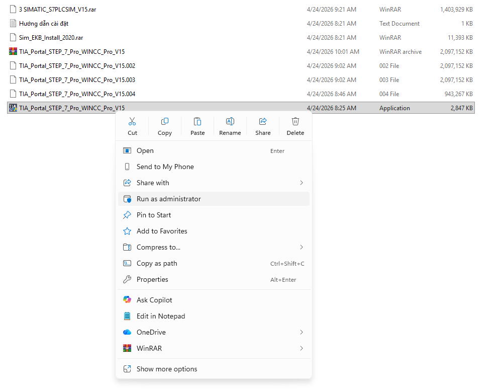 Truy cập vào thư mục vừa giải nén, tìm đến tệp tin mang tên TIA_Portal_STEP_7_Pro_WINCC_Pro_V15.exe. Bạn click chuột phải vào tệp tin này và bắt buộc chọn Run as administrator để cấp quyền quản trị cao nhất cho phần mềm.