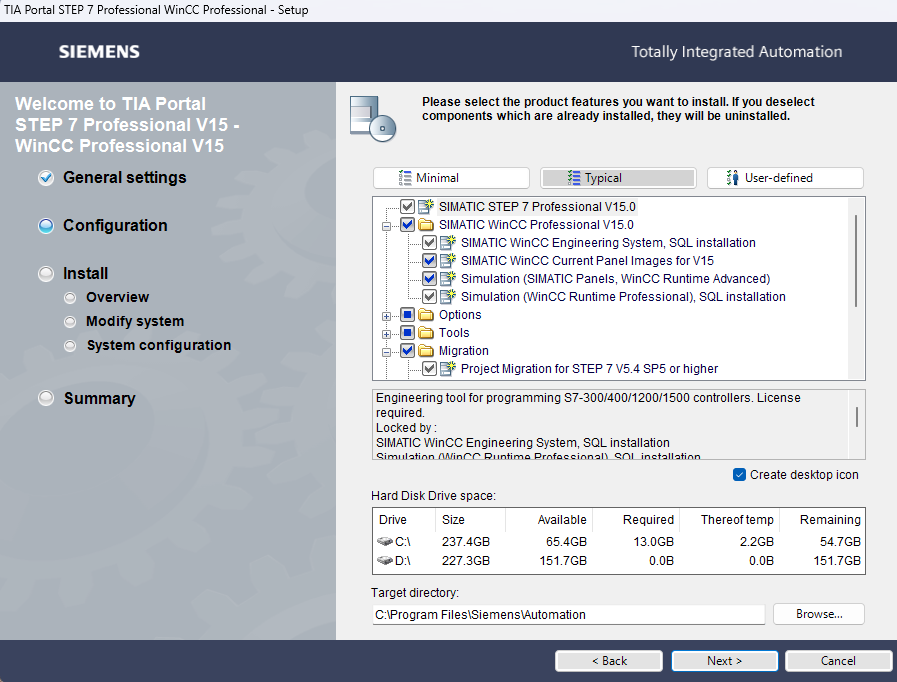 So với các phiên bản đời mới, V15 dễ thở hơn đối với máy tính cá nhân. Tuy nhiên, hệ thống của bạn vẫn cần đáp ứng các tiêu chuẩn phần cứng và phần mềm khắt khe của Siemens. Dưới đây là bảng thông số cấu hình tiêu chuẩn: