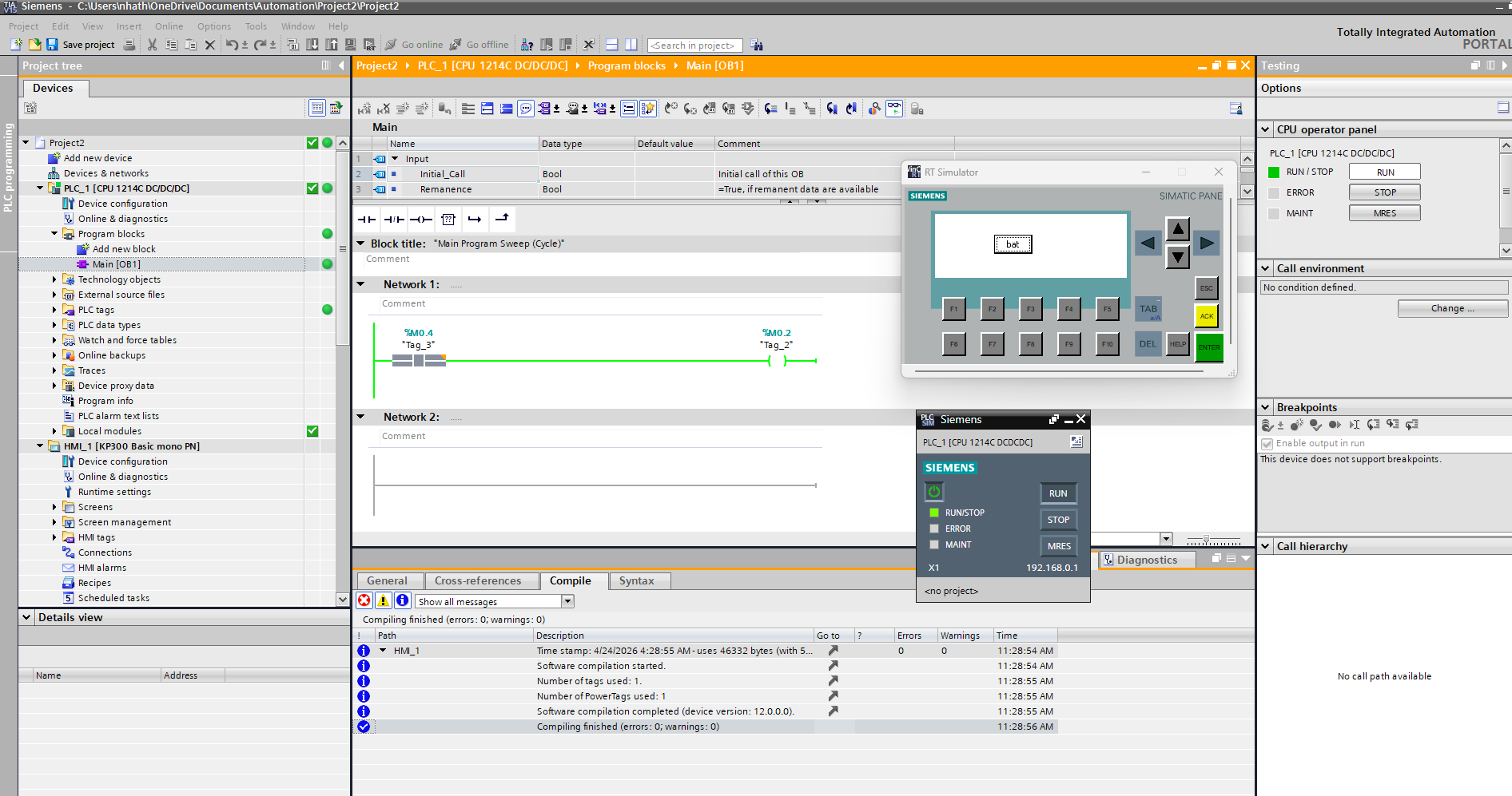 Để kiểm tra, bạn hãy thử khởi động phần mềm, tạo một project mới, thêm vào cấu hình phần cứng một mã PLC S7-1200 bất kỳ và viết một đoạn chương trình cơ bản. Sau đó, nhấn khởi chạy PLCSIM. Nếu cửa sổ PLCSIM mở lên, kết nối được thiết bị và cho phép Download to device, hệ thống của bạn đã sẵn sàng làm việc.