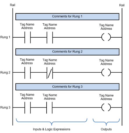 Một chương trình Ladder được thiết kế theo dạng hình thang với hai thanh nguồn ở hai bên. Các dòng lệnh nằm ngang được gọi là rung, nơi chứa các điều kiện logic và kết quả điều khiển. Khi xây dựng chương trình lập trình plc ladder, kỹ sư sẽ sắp xếp các tiếp điểm đầu vào và cuộn dây đầu ra trên từng rung theo logic mong muốn.