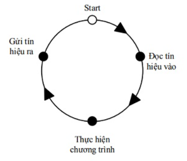 PLC thực hiện chương trình theo chu kỳ quét liên tục. Trong mỗi chu kỳ, hệ thống sẽ đọc trạng thái tín hiệu đầu vào trước, sau đó xử lý toàn bộ logic trong chương trình Ladder từ trên xuống dưới. Cuối cùng, PLC cập nhật trạng thái mới cho các đầu ra.