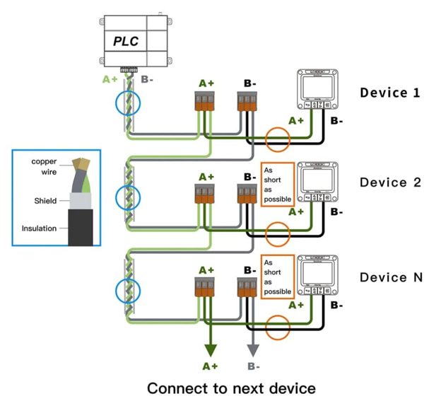 - Tuân thủ đấu nối hình chuỗi nối tiếp (Daisy-chain): Thiết bị bắt buộc phải được đấu nối luân phiên từ trạm này sang trạm khác tạo thành một đường thẳng dài. Tuyệt đối không được phép chia nhánh hình sao hay xương cá tự do, vì điều này sẽ tạo ra vô số các điểm dội tín hiệu gây méo dạng sóng.