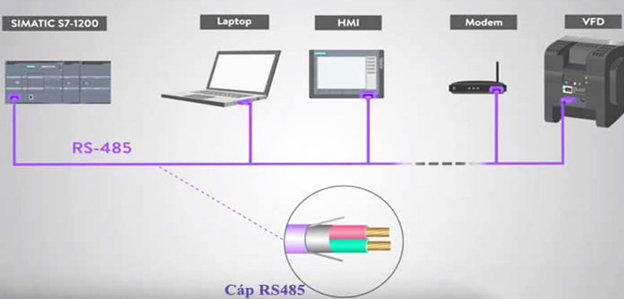 - Giảm thiểu tối đa số lượng dây dẫn: PLC chỉ cần sử dụng một sợi cáp đôi duy nhất đấu nối tiếp chạy qua hàng chục bộ biến tần, giúp không gian tủ điện gọn gàng, tiết kiệm vật tư và cực kỳ dễ dàng khi cần dò dây bảo trì.