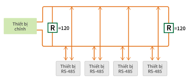 - Triệt tiêu hiện tượng dội sóng phản xạ: Tại vị trí phần cứng của thiết bị đầu tiên và thiết bị cuối cùng trên tuyến cáp, kỹ sư bắt buộc phải hàn hoặc vặn thêm điện trở đầu cuối (thường có giá trị 120 Ohm). Điện trở này được nối song song giữa chân D+ và D- để đóng vai trò như một bức tường xốp, hấp thụ hoàn toàn các xung tín hiệu dư thừa dội ngược lại khi gặp điểm hở mạch.