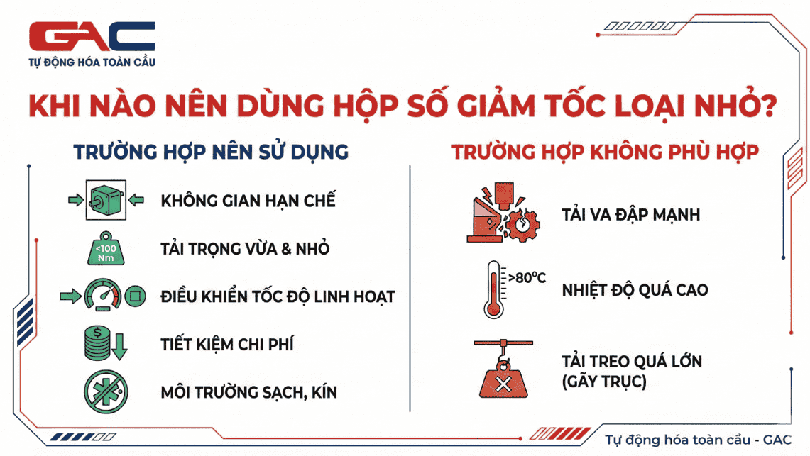 Từ những phân tích trên, có thể đúc kết rằng bạn nên ưu tiên sử dụng hộp số giảm tốc loại nhỏ khi: